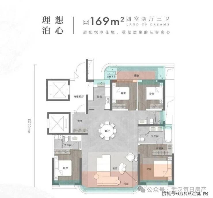 建面约169平是四房两厅三卫双主卧套房: