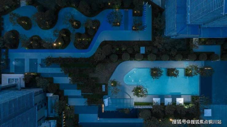 傍晚,戏水池星光灯闪烁,多层次植物与空间巧妙结合,营造出沉浸式的滨海度假感,维护成本高昂的同时,非常考验开发商开发水平和物业实力。