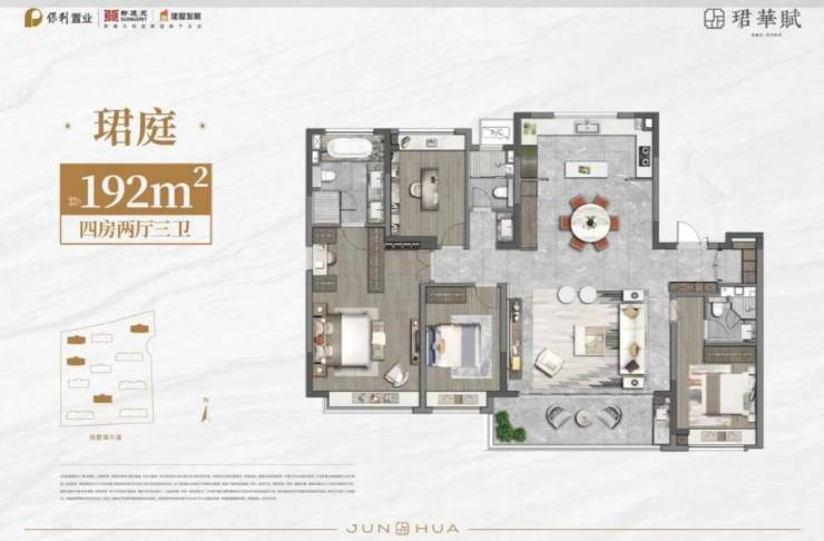 :152㎡、156㎡、190㎡、222㎡(均为四房以上设计,主卧套房化)