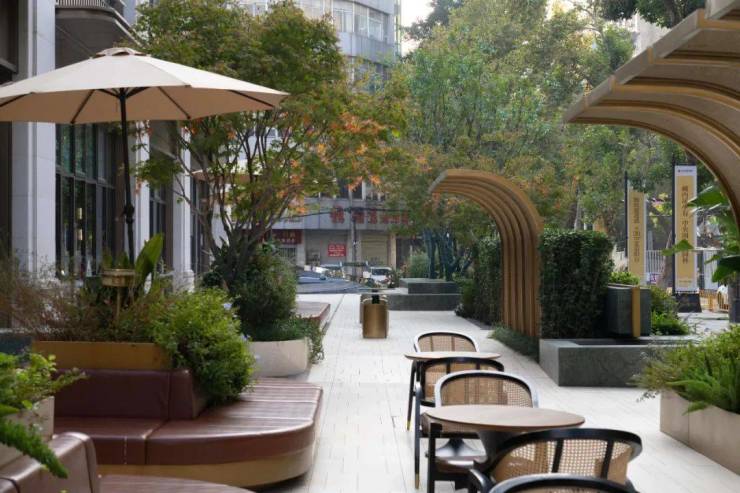 如果要用一种芬芳为我们的街区注释的话那一定是咖啡的香气,因此室内也将销售大厅打造成咖啡厅的场景,我们希望景观是室内咖啡馆的延续,所以 在沿建筑区域利用围合的户外家具,遮阳伞和特色屏风还有植物营造出时光咖啡厅,那是在阳光穿过树荫洒下的斑驳中惬意的午后时光,这里是时光的艺术走廊,也是城市的户外咖啡厅,花的香气和咖啡的香气融在一起让整个场域散发出迷人的浪漫气息。
