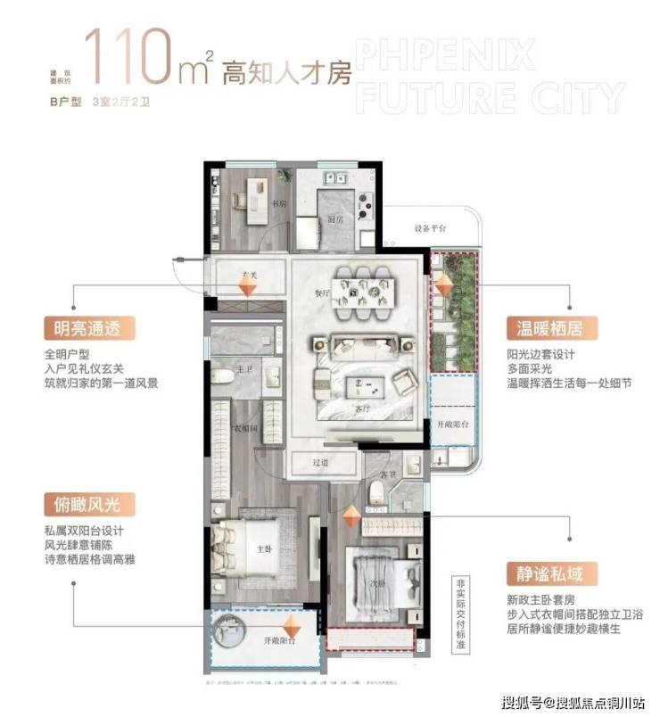 以极受欢迎的建面约110方户型为例,大三房格局既满足了不同阶段的家庭需求,又控制了整体面积的大小,实实在在的为青年人才减负。