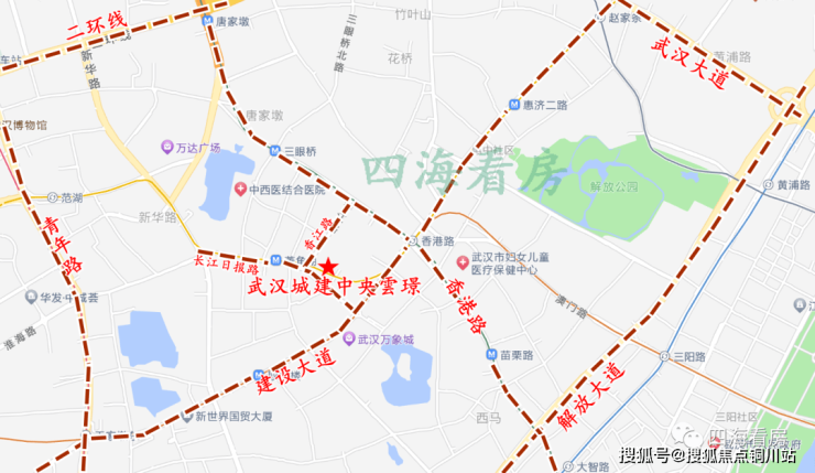 武汉城建中央雲璟位于汉口香港路与长江日报路交汇处,楼市划分属于汉口核心建设大道金融街板块,行政划分属于江汉区,距离二环线约1.8公里,距离内环线约1.6公里,属于1.5环。