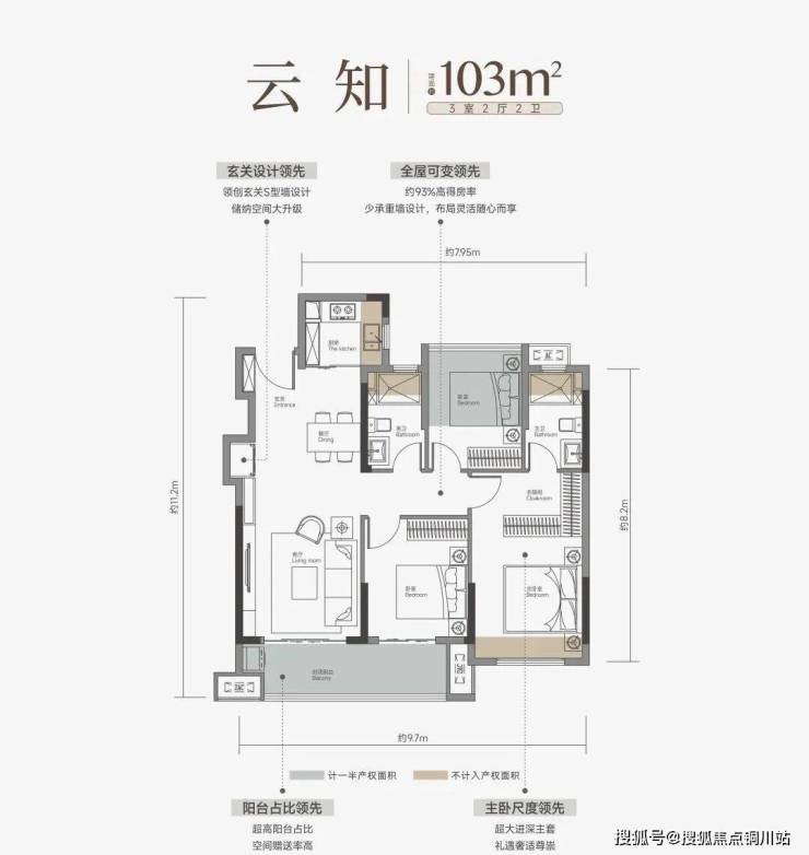 103平户型优化后得房率约93%,实得面积约96平,比市面上建面约105平准四代户型还要大。