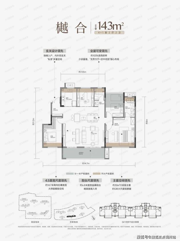 建面约142平户型,4+1房两卫,南北通透,6个飘窗全赠送,2个阳台,南向开间约14.7米,主卧大套房设计。