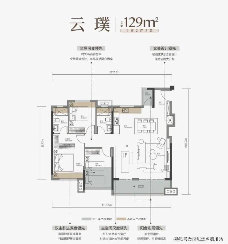 高层建面约129平边户,全明户型,南北通透,实得面积媲美市面上建面约150平户型。