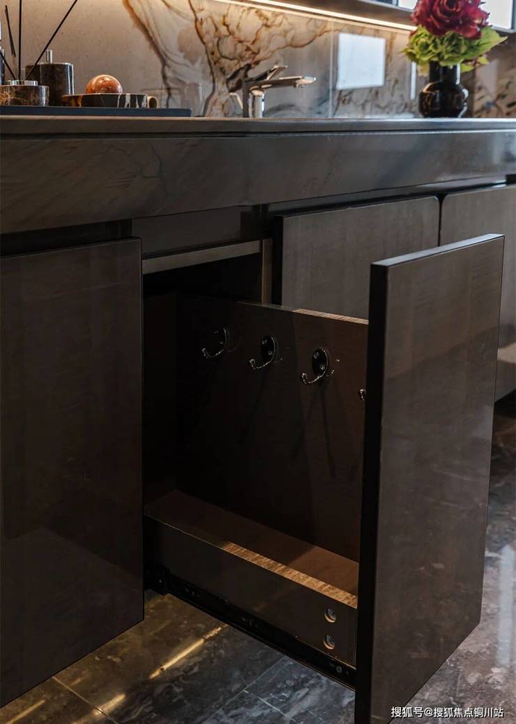155㎡户型的卫浴空间,以皮革的细腻与木质的温润悄然对话,于方寸间勾勒出富有温度的生活场景。美妆镜门、抽纸孔等细节的精心雕琢,让日常盥洗升华为一种从容不迫的仪式体验。