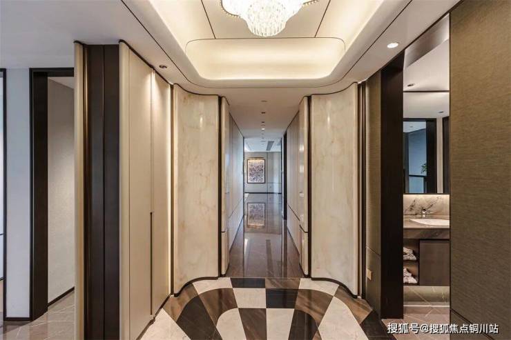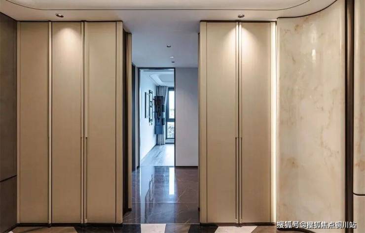 225㎡户型以轩阔的十字门厅,将归家仪式感从容拉满。玄关通往客厅的过道,右侧以整墙收纳重塑空间界面,极大地满足了日常收纳所需,整洁利落,储物能力拉满。