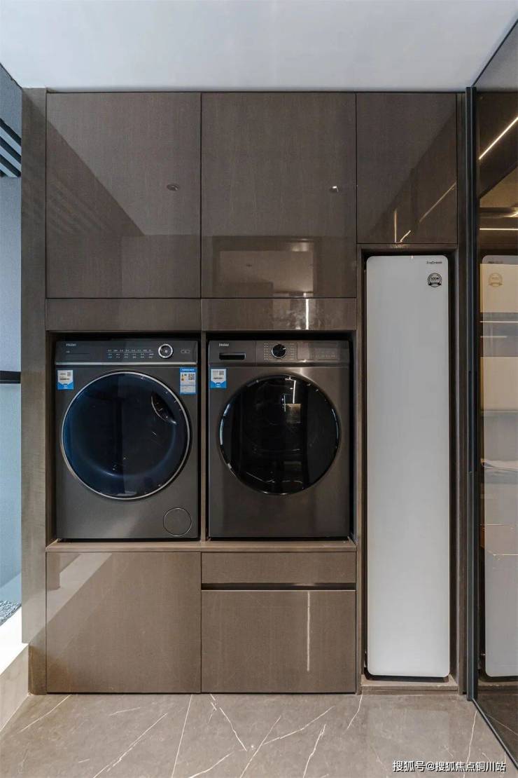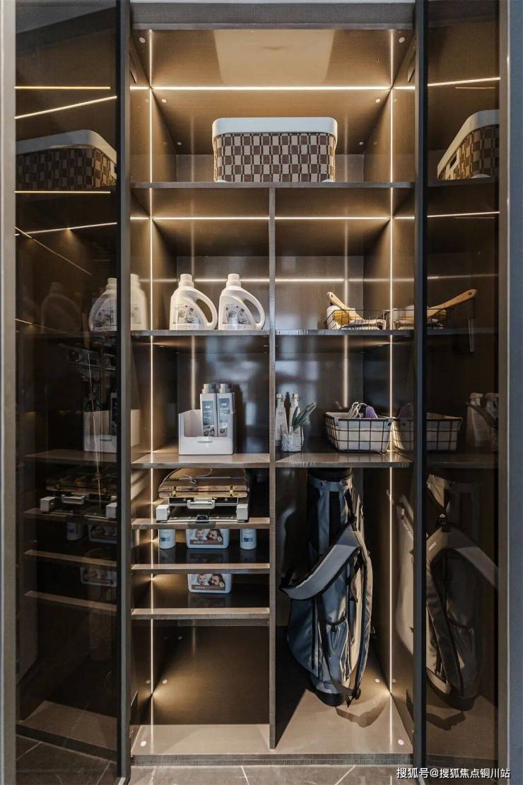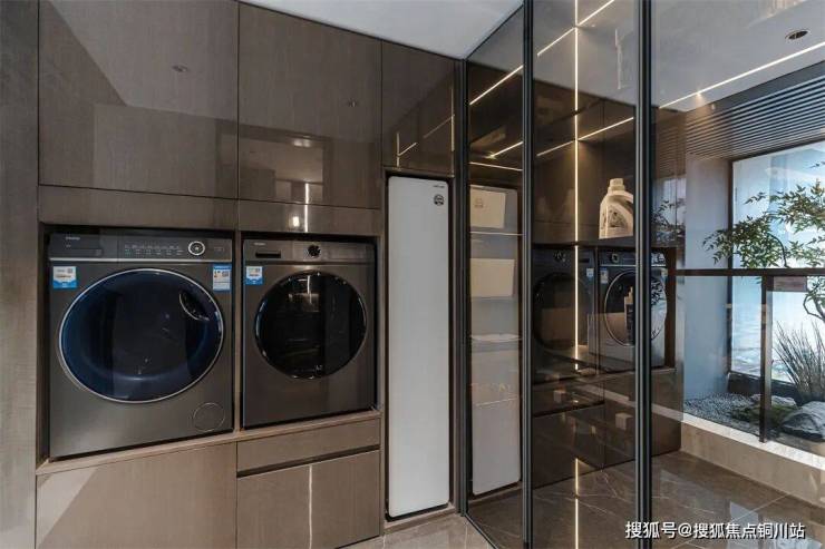 225㎡户型入户右侧空间,系统化整合公卫、家政、衣物晾晒区,归家即洗手,出门可整理,于细微处守护日常安全与从容。