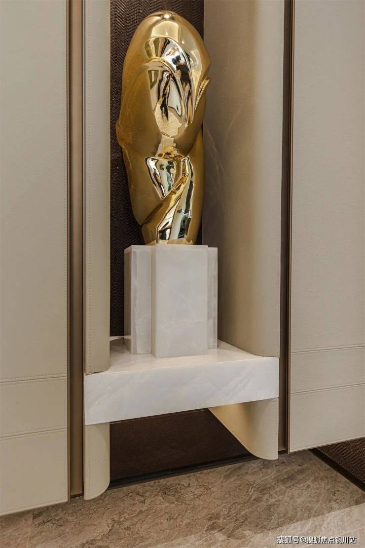 步入玄关空间,浅色系玄关柜映入眼帘,皮革材质的加持,让优雅的气韵更为浓烈。以简约弧度过渡的边角,曲线造型减弱了家具的棱角感,以一种低调而不失贵气的展现方式,吐露内敛而高贵的氛围表达。