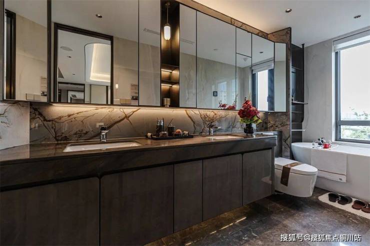 225㎡户型深色浴室柜以静谧含蓄的姿态融入空间,柜门边角做圆润化处理,流畅的线条弱化了柜体的厚重感,为卫浴空间注入一丝优雅与温润。镜柜内部巧妙嵌入美妆冰箱,为日常护肤增添一份精致从容。