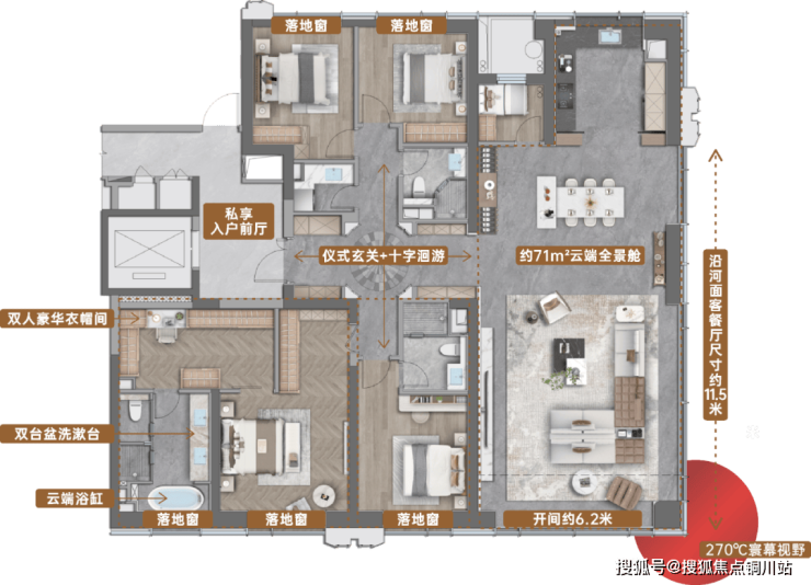 龙湖・山河颂建面约270㎡户型产品的突破,在于270°环幕观景设计——客厅与餐厅衔接的大面落地玻璃幕墙,形成约11.5米沿河面客餐厅观景尺度,将千年运河风光与半壁苏州的城市天际线完整纳入室内。