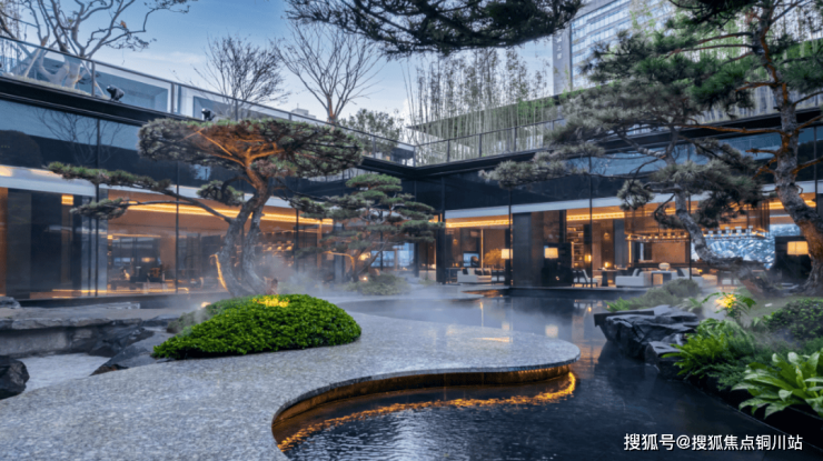 项目所在的地块堪称狮山极核——日趋紧张的当下,项目充分利用土地空间打造景观与公区。示范区园林,以“万壑松风”为灵感,提炼松林、飞瀑、石径、云雾、流泉五大场景,5棵泰山全冠移植的黑油松傲然挺立,约6米高的黑金沙花岗岩叠景墙流水潺潺,更有“翠玲珑竹节景墙”致敬沧浪亭,将苏州文化符号转化为可触摸的日常景观。整个社区景观面积充足,形成“内外双园”的格局,内部园林与外部运河景观相互呼应,为业主提供了静谧的休憩空间。