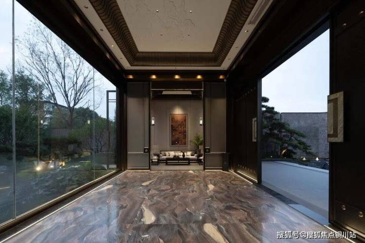 落地窗将园内山水尽数框景入画,引人心驰神往,顶部四方形的藻井层次丰富,屋顶雕刻有如意祥云纹,将吉祥如意的美好的愿景贯穿始终。