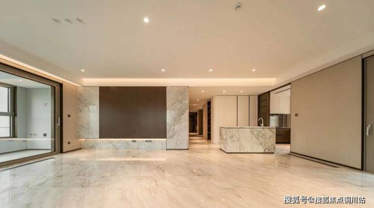 LDK一体化设计的环幕端厅,以约7.3米的南向面宽,将客厅、餐厅、厨房融为一个开阔无界的整体空间。延续而来的高级中性色调——浅米色的石材地面、暖灰色的木饰面、精致的金属线条——共同构成了包容且大气的背景,让室内家居与窗外的自然光影成为主角。