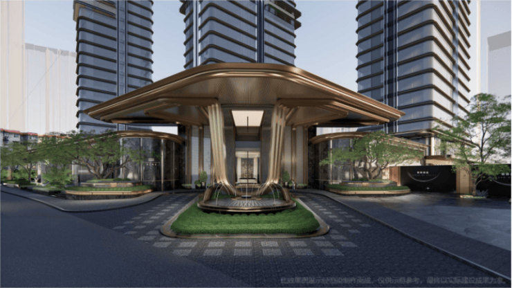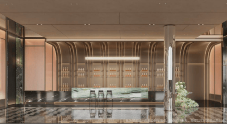 超10米挑高、约26米面宽的豪奢社区归家大门,如江面初升的朝阳,带来四射的光芒;约5.8米高寰幕穹顶的归家通廊,来自君悦酒店的灵感,约1450根定制发光水波纹管,鎏金金属线条交织水纹玻璃,如晨曦洒落江面,光影律动;会所大堂,约3米直径圆形悬浮吊顶与香格里拉翡翠珍罕石材墙面辉映,如月光诉说着江的故事;归家必经的电梯厅,精选奢石纹理,组合形成如江水灵动清冽,让每一次抵达都沉浸于江的氛围。