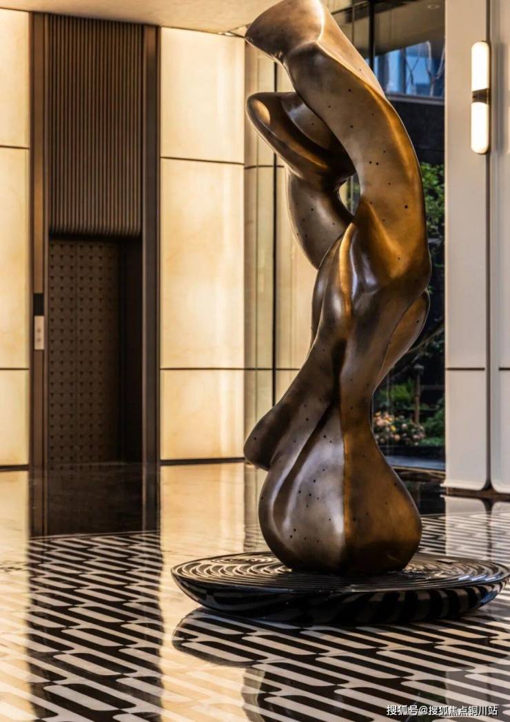 在地下大堂,项目践行“奢华隐于微处”的美学哲学,传统车库立柱被天然玉石温柔包裹,表面经哑光处理,质感温润如脂,光泽柔和似釉。当车辆灯光掠过,玉石表面泛起幽幽暖光,将原本的过渡区域,转化为一个具有美术馆般静谧质感与物质亲和力的迎宾序厅。它无声地宣告:真正的品位,在于对每一寸生活轨迹的尊重与艺术化提升,让最平凡的日常归来,也充满被珍视的仪式感。
