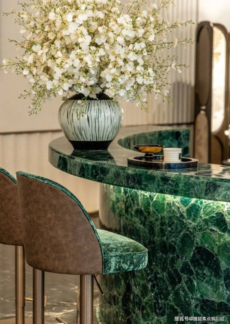 而翡翠晶绿则成为灵感客厅的视觉焦点,选用绿水晶石材精琢而成,其内部晶体与流动纹路在光下折射出深邃至清澈的绿色层次,宛如一件表现主义雕塑。在深色石材、不锈钢金属、艺术涂料构成的背景环境中,这一抹浓烈而神秘的绿,迸发出极具张力的艺术气息,成为空间中激活感官的诗意咏叹。