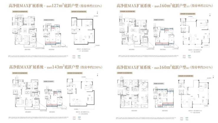 这是127-143-160㎡三个面积段的户型图,其中主力户型是143㎡,得房率约101%。