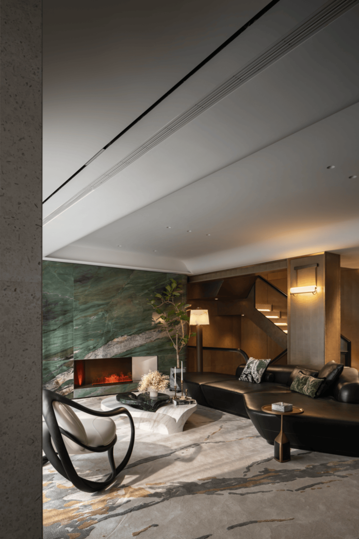 黑色皮革沙发以长江为灵感蜿蜒铺陈,曲直相生的轮廓暗合江水奔涌的哲学;双层大理石茶几若水中绽开的并蒂莲,花瓣肌理由汉白玉与墨纹岩对话,刚柔并济中托起现代生活的仪式感。