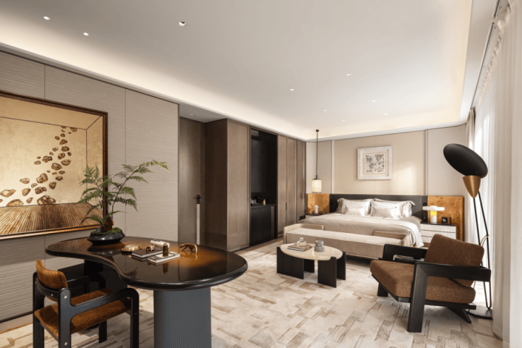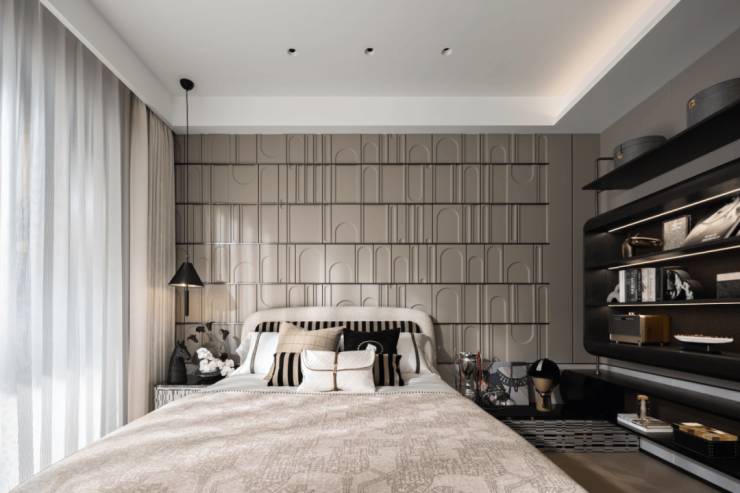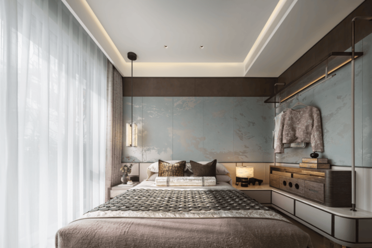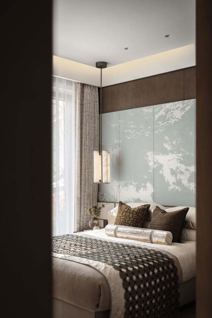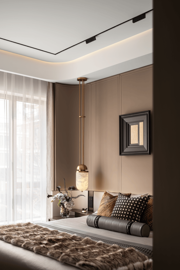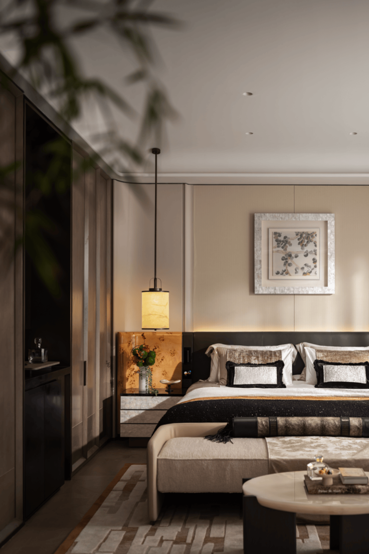 温和的雅棕色与岩黑奠定品质基底,深色床头柜与黄铜台灯形成冷暖对比,床尾超薄立板实现视觉悬浮,暗合楚式漆器“举重若轻”的造物智慧。