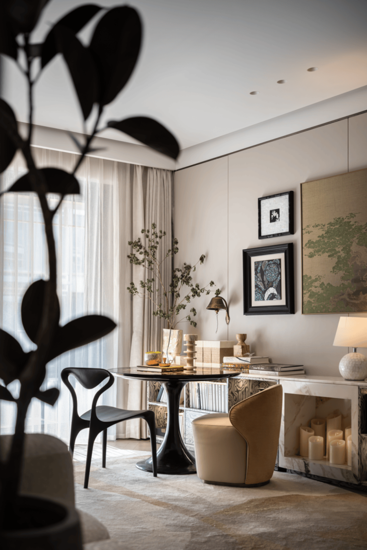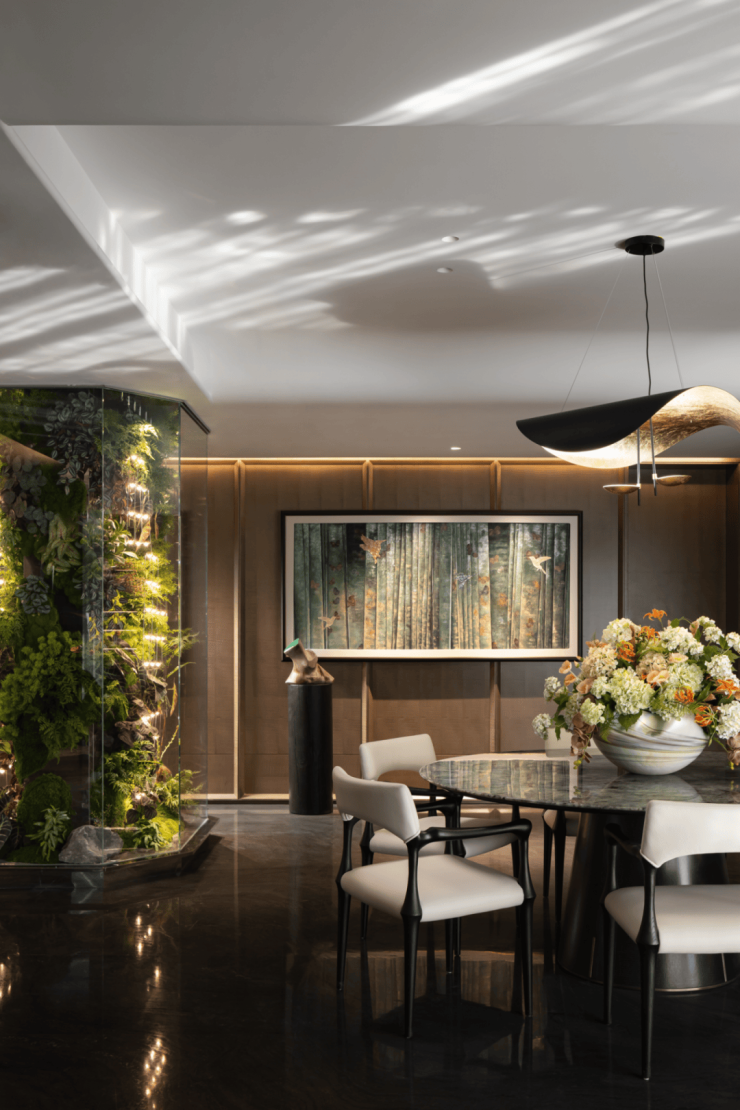 客厅以黑白为底,将江城山水化作空间的设计亮点。两处玻璃绿植屏风,层叠枝叶如一幅山水卷轴,将自然苍翠裁入一室。