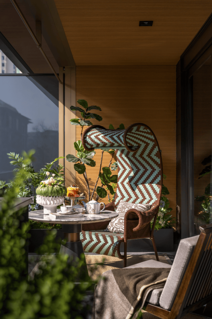 阳台之上,天然绿植与亚麻软垫交织出热带岛屿的松弛感,椅背弧线与周边绿植构建出一处城市森林,身临其境感受生活的松弛与悠闲。