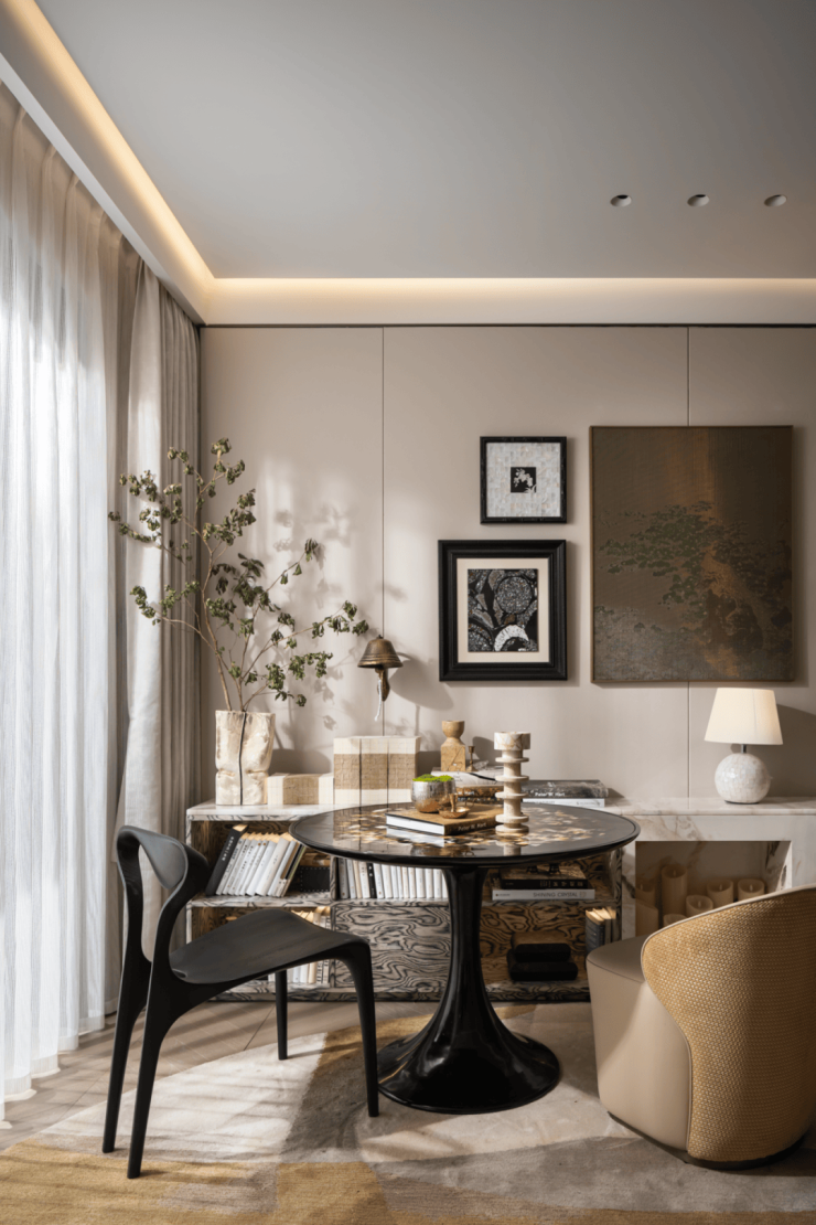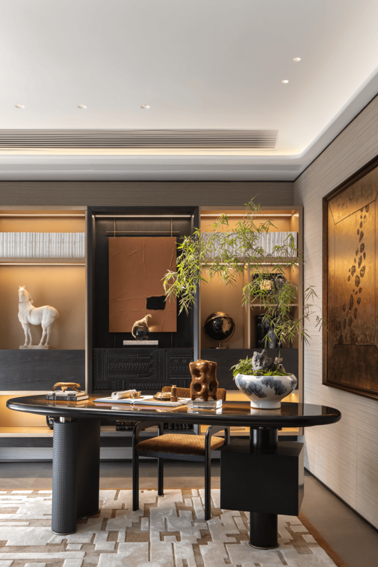 二层主卧与书房相连,中央不规则书桌似光滑如玉幻化新生,天然生漆堆叠出琥珀光晕,在灯光下浮现金沙般的神秘辉芒。