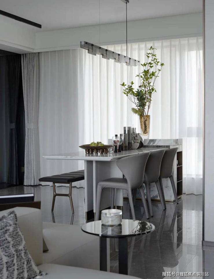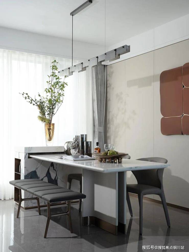 餐厅融合素雅的色调与极简的线条,勾勒出“家”最本质的精神内核。以浅灰色餐椅,配以简约的大理石餐桌,皮革与石材的碰撞,将内敛的奢华质感浸润空间的每一处细节中。以极简的几何抽象艺术画和花艺作为点缀,将艺术的灵感和美学氛围在空间中蔓延,抒发动人的浪漫氛围。