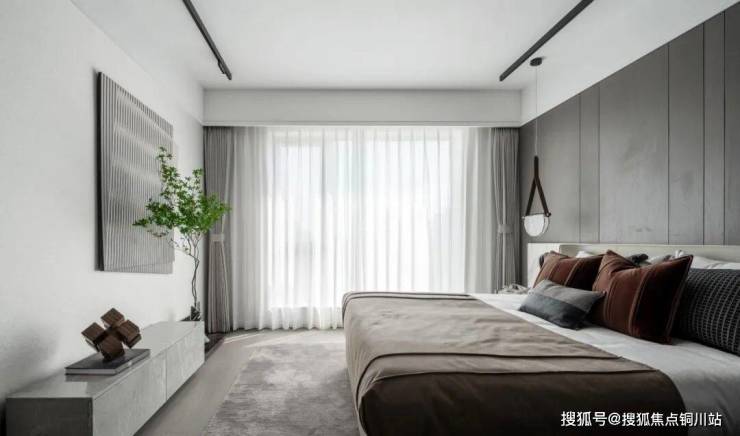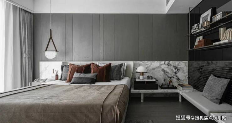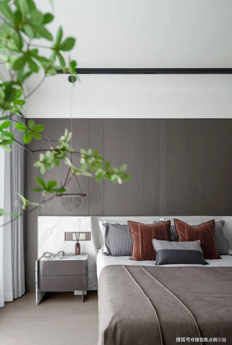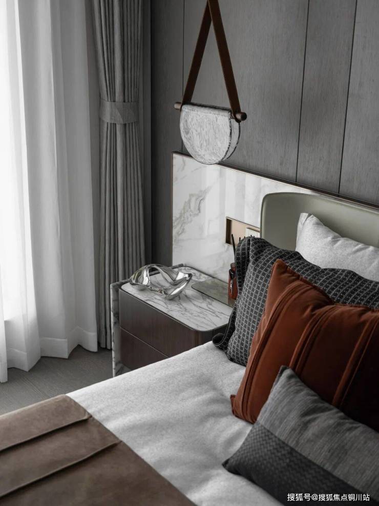 主卧延续了大地色系的沉稳色调,阳光轻洒,散发出一种安静的力量,糅合时间的沉淀,凝练自然的静谧。适度的棕色调,沉稳而平和,柔软的织物,温润的木质背景墙,柔和了大理石的凛冽,于喧嚣繁城中找寻一处雅境之地,感受家的温度。