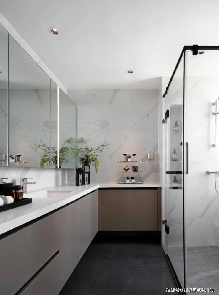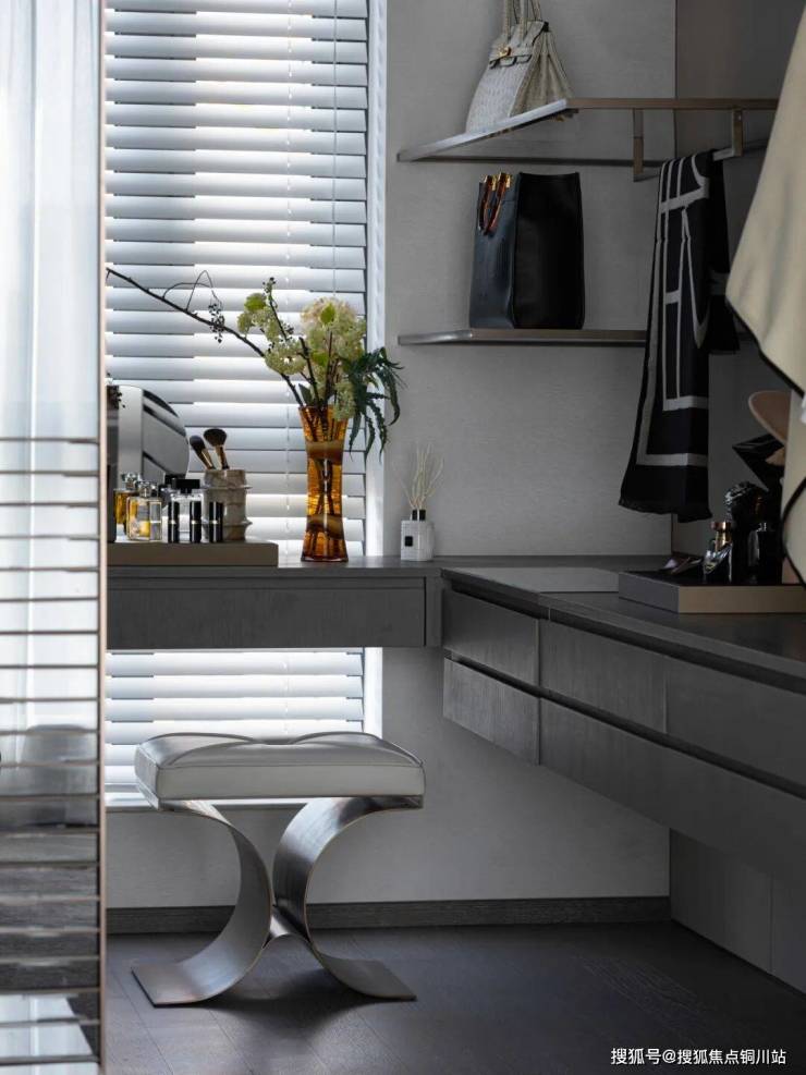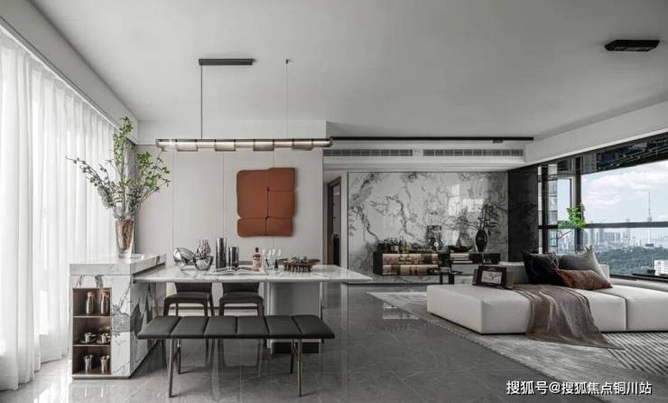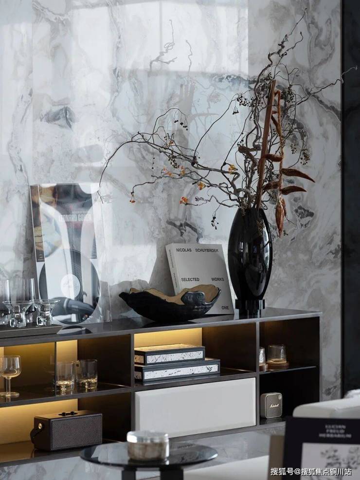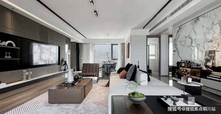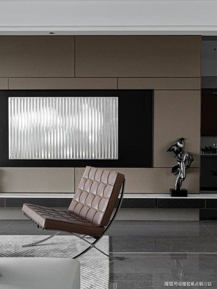 以大地色调描绘沉稳、大气、雅致的艺术氛围,搭配水墨韵味的大理石背景墙,将生活的雅趣置于场景的塑造中。艺术品的陈设、柔和的光影,装点着空间的质感,赋予“家”永恒经典的仪式感,承载着对生活的热爱。客厅以多元的场景构建,电视面、Minibar、茶室三面交互生活场景。家庭所有美好场景围绕客厅展开,女主人可在此阅读、享受愉悦的下午茶,男主人则在一旁小憩,享受一杯红酒时光。还原生活的不紧不慢,收获都市中的自然和柔软。