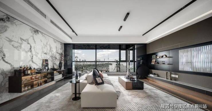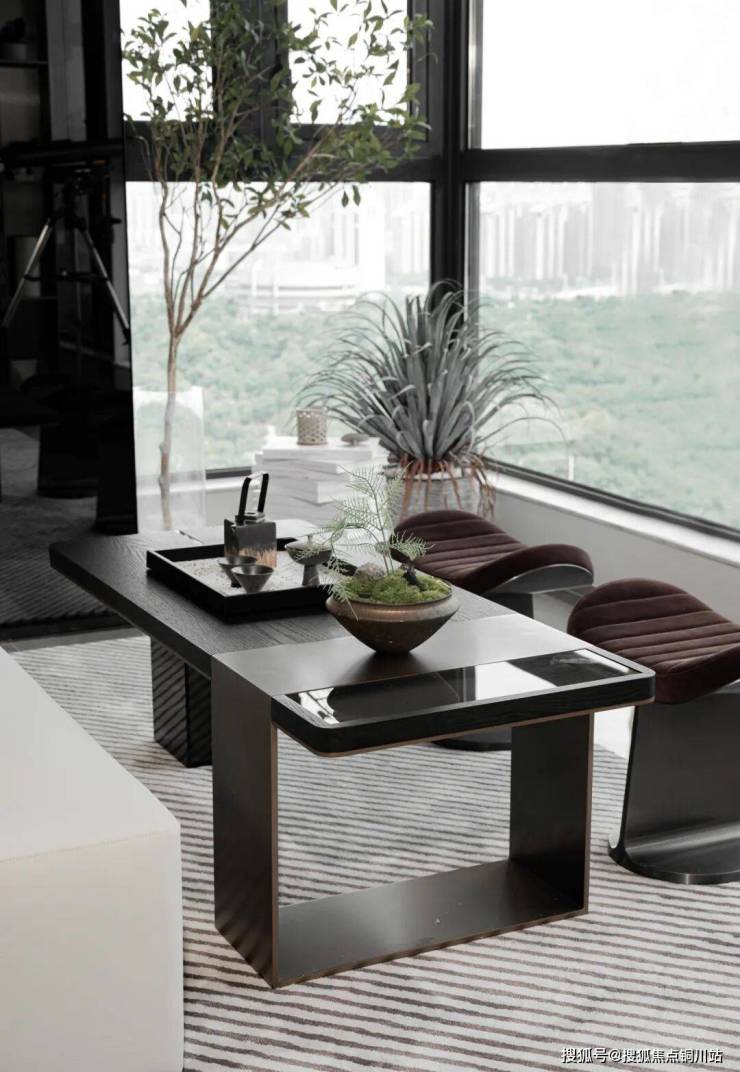 客厅以奢阔的尺度、开放式的布局,纵享多元而奢雅的极致体验,融汇城市精英高品质的生活方式,结合艺术视角,在时光雅集中,构建都市理想人居新范本。阳台运用了黑色镜面的折射,增强了空间的奢阔视觉,赋予了空间灵动的质感。