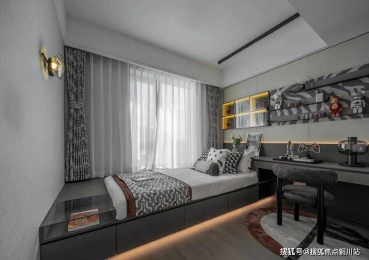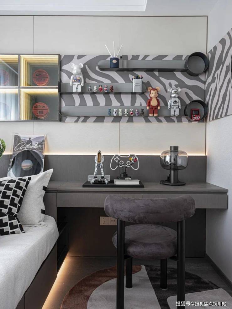 以时尚潮玩为主题的男孩房在活力个性的气质中提炼出空间的品质感,背景墙以别具一格的展示形式,配合灯光的映衬效果,将天马行空的艺术创想展示于此,开启无尽的想象力。