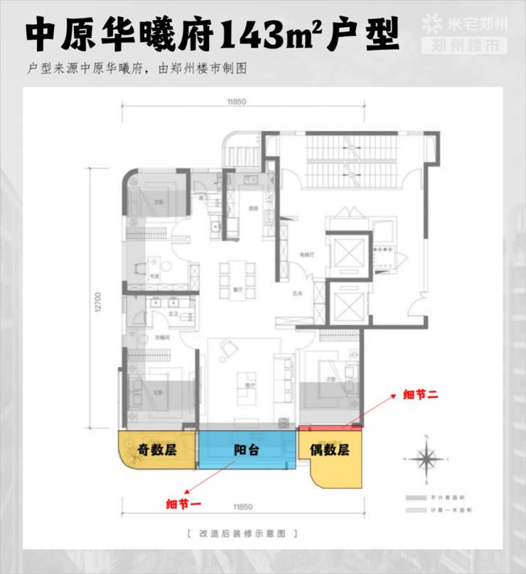 这是中原华曦府二期143㎡的户型,乍一看似乎有些平平无奇,但有两个细节需要重点解析下。
