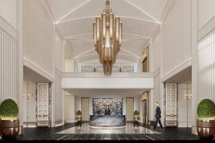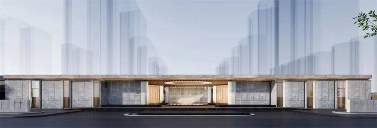两侧立面采用爱马仕灰石材,搭配白冰玉奢石,营造出三列九阵迎宾立面。