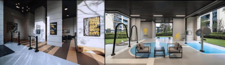 项目在设计之时便根据每栋楼室外景观功能的整体布局,和架空层面积的大小,对应地设置了会客品茗馆、健身瑜伽馆、亲子互动馆、文化养心馆和老年健身馆。架空层的功能与室外的景观节点相互渗透、赋能,实现无惧风雨和无界互通。