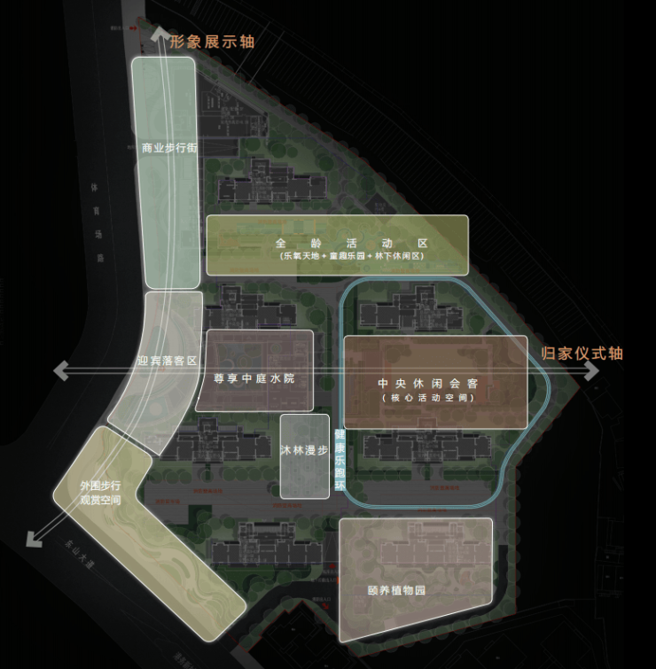 现在已经呈现的迎宾落客区、中庭水院,和建设中的中央休闲会客区,则共同构成了连接东西景观节点的归家仪式轴。