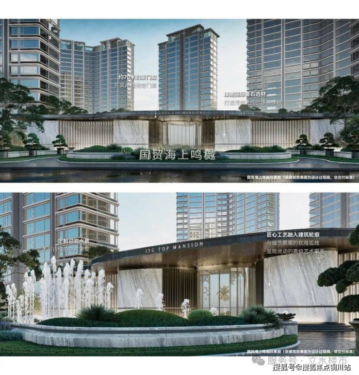 匠造约70米归家门庭,开篇岸线传奇门第,臻遴国际奢石选材,天然纹理的整体铺陈,定制迎宾水景,打造高定归家礼遇。