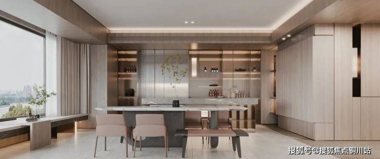 巨型LDKB串联起了“休闲阳台+客厅+餐厅+中厨+西厨岛台,所有的公共空间全部互通,家庭成员之间无论处在哪个区域,都能时刻保持着很好的互动,形成家庭的社交中枢。
