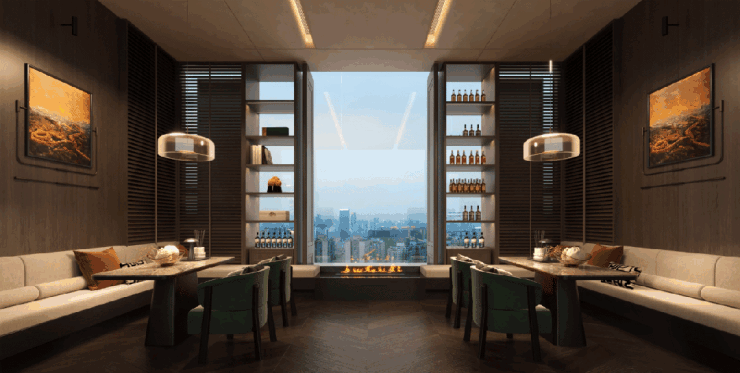 恒隆府于一座41-42层重磅打造了隐于140米高空的天际会所,规划了天阶恒温泳池、私宴棋牌、轻氧GYM、威士忌雪茄室等多功能场景空间。