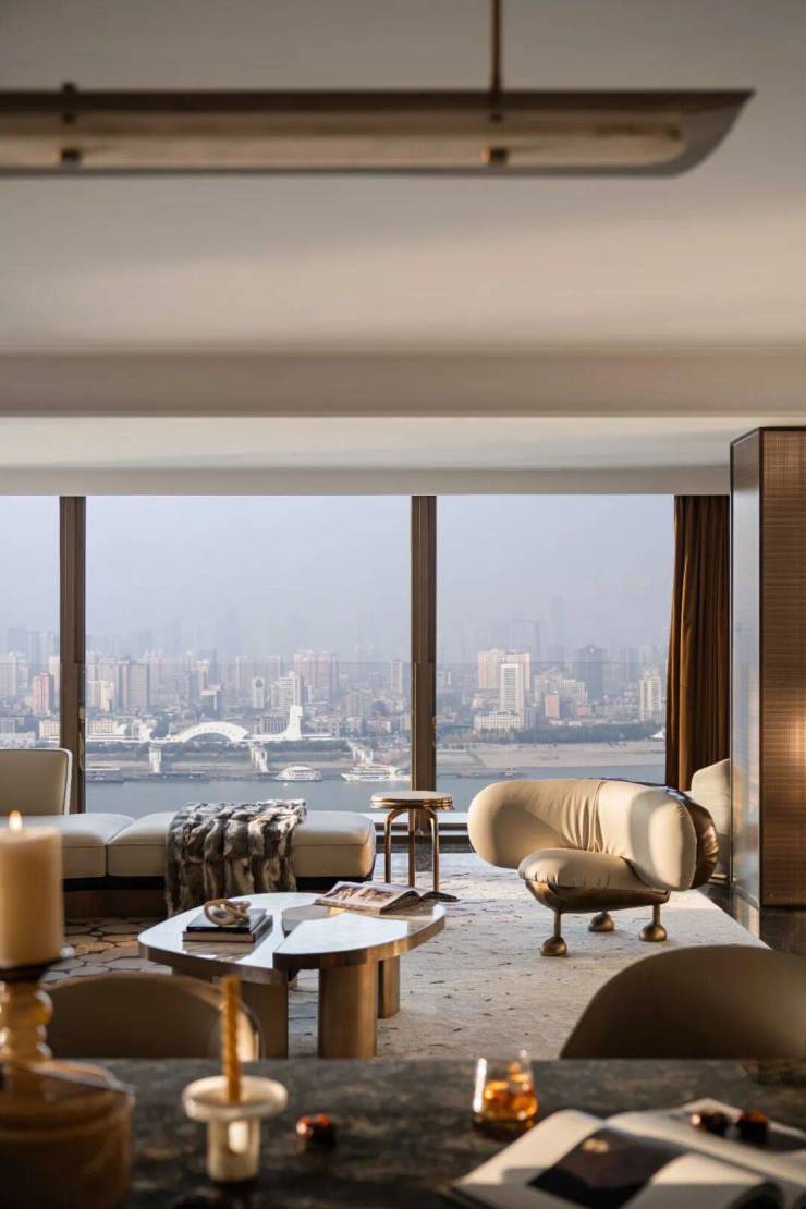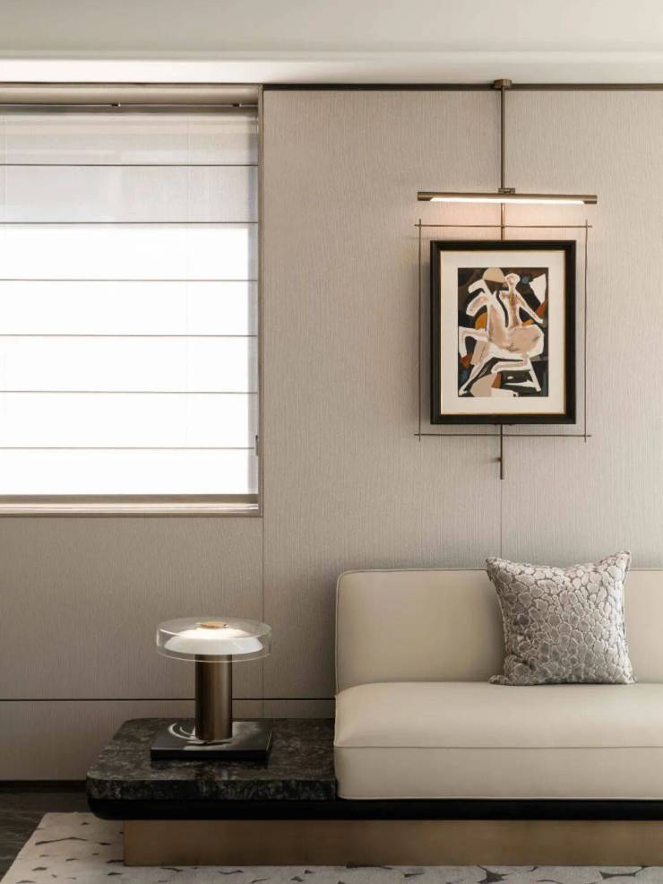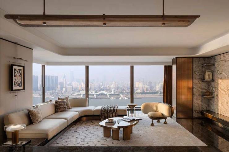 客厅落地窗引江景入室,阳光洒落,暖意流淌,软装以艺术品与饰品点缀,注重饰品的精致度与高级感。艺术与生活美学在此交融,自然与空间的融合,共同勾勒出一个充满艺术张力的生活场景。