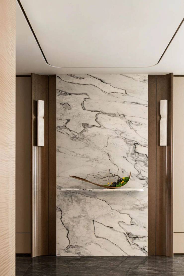 入户玄关以环抱的姿态迎接归家。云石质感的壁灯,搭配立体优雅的艺术装置,宛如一幅静谧的画卷,进入完全属于自己的悠闲时光。整体空间以浅米色系为基调,搭配金属线条、大理石与皮革,营造出优雅奢华的空间质感。软装以中性色为主,融入金属与奢石元素,色彩选取江面落霞般的橘色,以点状形式巧妙铺陈。家具以皮革为主,搭配高级肌理面料,整体陈设传递出现代时髦感。