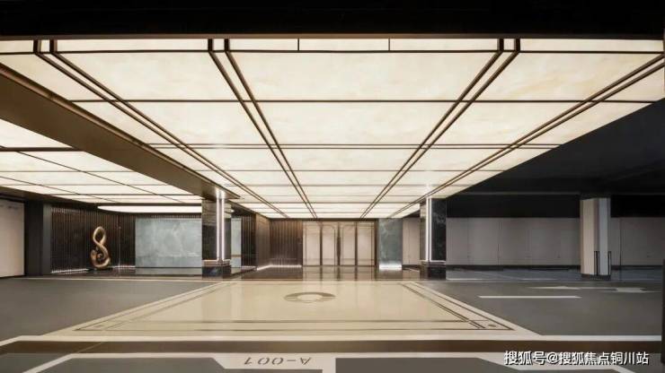 出入口通道顶部采用铜钱纹铝板吊顶,配合内嵌线型灯带,仪式感直接拉满。坡道两侧由仿石材板及不锈钢细节点缀,凸显设计感和立体感,顶部镶嵌家徽专属LOGO,形成归家崇高礼仪。