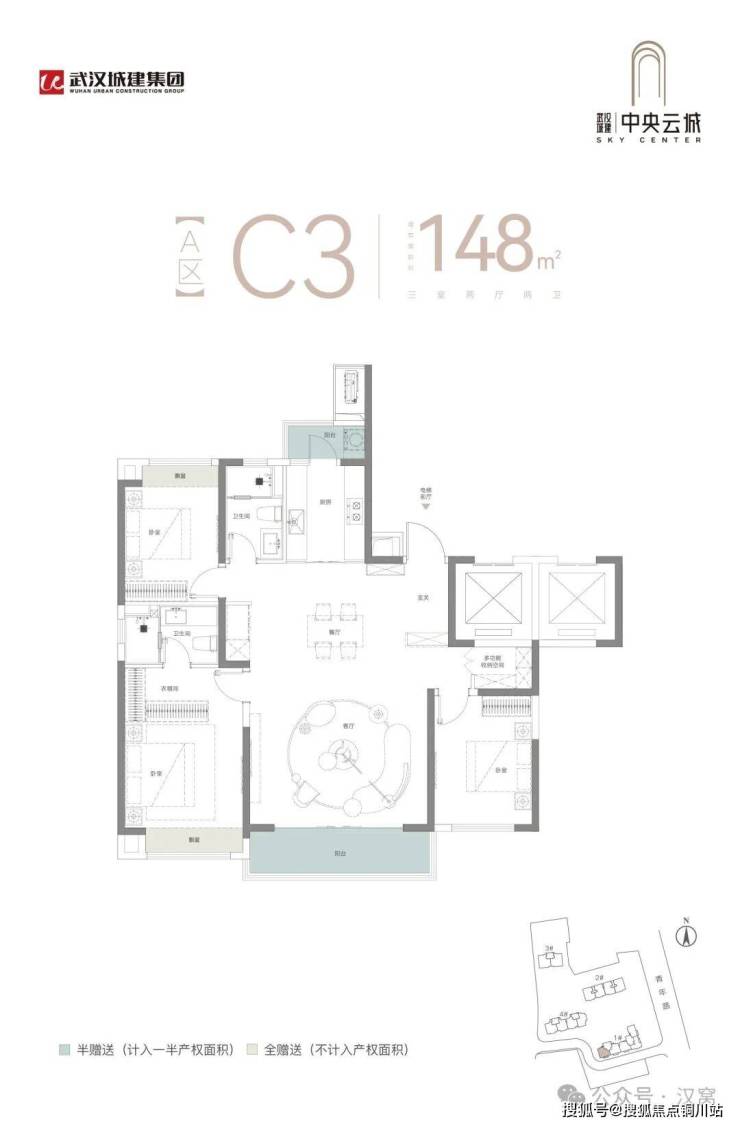 A地块中小户型(128-148㎡):多数做到了三房两厅两卫,采用了诸如独立玄关、大横厅(如128㎡户型约5.8米,140㎡户型约6.3米)、双阳台、主卧套房、洄游动线等设计,旨在提升空间感和舒适度。