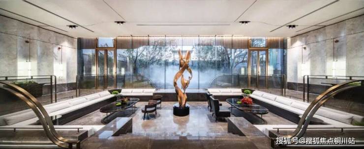 在入户大堂内部的下沉会客厅,项目采用整扇无边界玻璃加以大尺度的香槟金铝板密拼挑檐组成了落客洽谈区,窗外园中“悬瀑园”的高山流水尽收眼底,就此上演生动的“无界山水”。