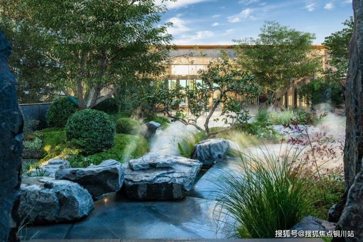 项目特邀享誉业界的顶尖设计团队执笔园林景观设计,利用架空层带来的地势高差,打造出约6米高的假山,一座中式凉亭置于假山之上,流水沿亭顶倾泻而下,随即流入山前水潭之中。