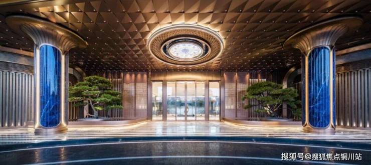 社区主入口前的4根金蓝立柱十分吸睛,它采用蓝色岩板配以古铜拉丝工艺不锈钢,在光线作用下绽放出宝石般光泽,仅此一处的建造成本就高达近千元每平。