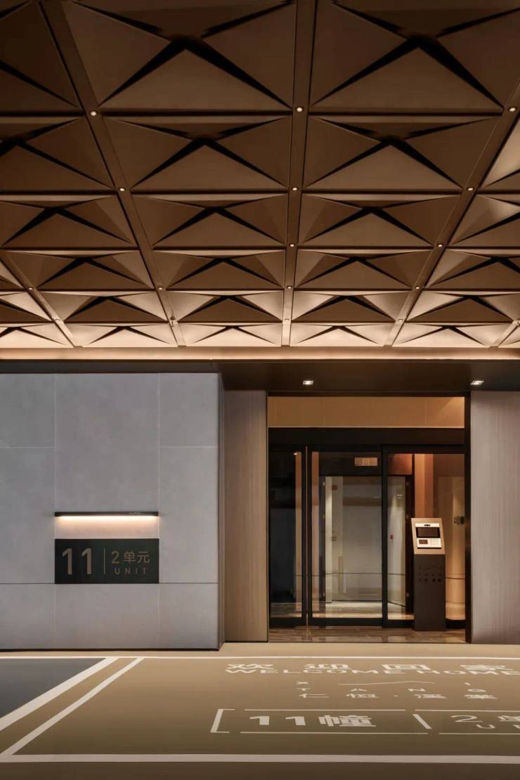 铝板、石材、金属格栅的组合使用,也让地上精装大堂格外有质感。