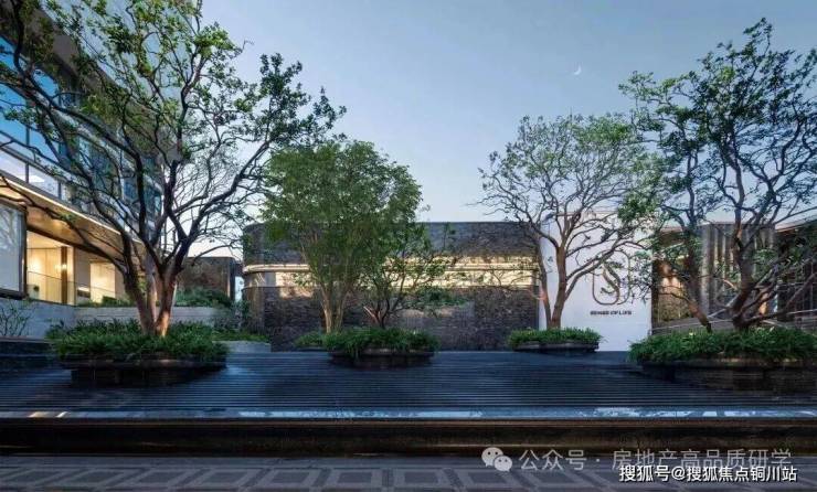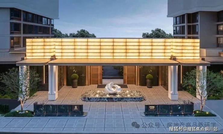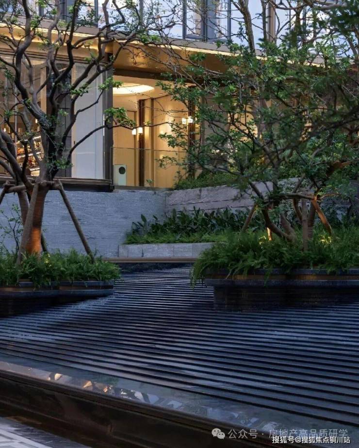 穿过小区大门后,眼前呈现一派绚烂水景,视野豁然开朗:五株婀娜香橼树在花坛中随风轻摆;叠层水幕沿着碧潭金沙、蓝眼睛花岗岩台阶潺潺流淌,营造出宁静祥和的归家心境。