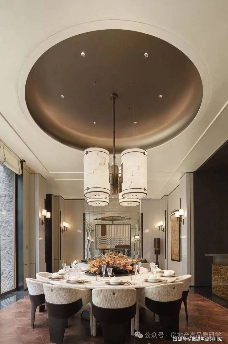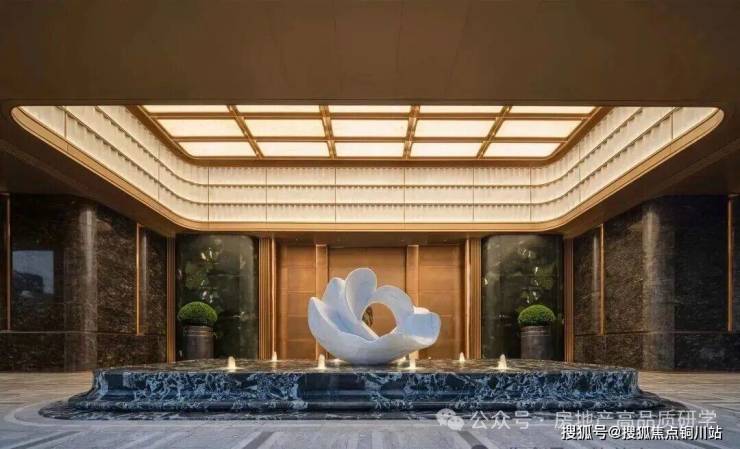 步入大门云石穹顶之下,匠心复刻古代“藻井”神韵,以522片皇家白玉精雕细琢,汇聚光华,辉映古今。华光流溢处,中心池水托举艺术雕塑,莹润皎洁,宛若稀世珍宝。立面更以铂金钻奢石铺陈,搭配墨绿荷塘月色奢石、安哥拉黑奢石花钵,以及手工锻造的巨幅铜门,于光影交错间流淌温润质感,尽显奢华风范。