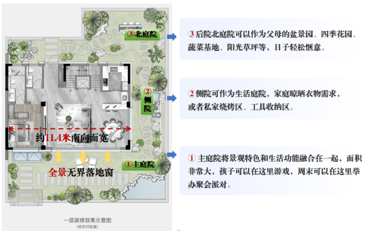 南/北向花园:作为家庭社交主场,可打造会客茶区、儿童乐园、阳光草坪。